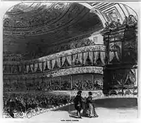 A rare etching of the interior of the theatre at this time depicts a production by Laura Keene in her theatre; From the point of view of the stage, it depicts what is probably the production of a classical text, with two figures in historical costumes standing downstage close to the footlights.[13] This etching, from the actors' point of view, gives a rare glimpse into theatrical production on the American stage in the pre-Civil War era.