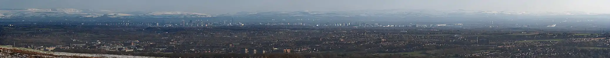 It offers views over Lancashire, Cheshire, Merseyside and Greater Manchester, including Manchester city centre, Salford, Werneth Low, Wigan and Bolton. In clear weather conditions, it also offers views of Blackpool Tower, the Dream in Sutton, St Helens, Jodrell Bank Observatory, Snaefell in the Isle of Man, the Cumbrian mountains, Snowdonia in North Wales, Liverpool, Southport, the Irish Sea, the Pennines and much of the North West of England. On a clear day the summit offers a view of four national parks: the Lake District, Yorkshire Dales, Peak District and Snowdonia.