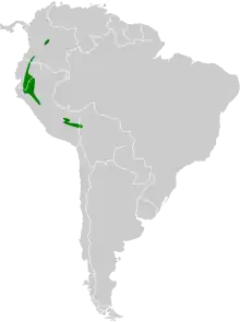 The wire-crested thorntail is found in the Andean foothills from eastern Colombia's Meta Department through eastern Ecuador into eastern Peru as far south as the Department of Puno. In addition, there is at least one sight record in Bolivia.[9][5] It inhabits the edges and interior of humid forest at elevations between 500 and 1,500 m (1,600 and 4,900 ft).[9]