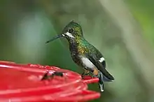 The wire-crested thorntail is one of the smallest birds on Earth, with a mature weight of about 2.5 g (0.088 oz).[8] Males are about 11.4 cm (4.5 in) long, including tail extension, and females about 7.5 to 8.2 cm (3.0 to 3.2 in). Adults of both sexes have coppery green upperparts with a white band across the rump. Males have a glittering green crown with a thin hair-like crest. Its gorget is iridescent green, the flanks brownish with a white patch, and the rest of the underparts black. The tail is steely blue with white feather shafts, deeply forked, and the outer feathers are very narrow which with the crest give the species its common name. The female does not have the crest. It has a broad white streak on the cheek. Its underparts are black with a white patch on the flank. Its tail is short, only slightly forked, and bluish black with white tips. Juveniles are similar to the adult female.[9]