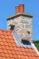 Traditional vernacular architecture in Jersey is in granite and such witches' stones can be seen protruding from many older houses. The real origin of this architectural feature is to protect thatched roofs from seeping water running down the sides of the chimney stack. Thatched roofs being thicker than tiled roofs, the jutting stones would sit snugly on the thatch – as can be seen on the few remaining thatched roofs in Jersey. When thatch began to be generally replaced by pantiles in the 18th century, and later by slates, the witches' stones were left protruding prominently from the chimney stack. This either gave rise to the belief in witches' resting places, or reinforced an existing belief. Fear of witches was widespread in country areas well into the 20th century in Jersey.