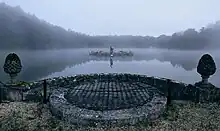 When Whitaker Wright bought Lea Park, there were already two ornamental ponds, formed by damming a small tributary of the River Wey. He re-landscaped the grounds, to create three much larger lakes, adorned with statues and fountains, one of which, in the shape of a dolphin's head, is carved from Italian marble.[26][27] Beneath the largest lake, now known as Thursley Lake, is an underwater conservatory and smoking room, connected to the shore by glazed tunnel and accessed via a stone staircase. Above the conservatory is a statue of Neptune, which appears to float on the surface of the water.[28] The glass structures were constructed before the lake was filled and a reinforced with iron rings, of an identical design to those used on the Metropolitan line of the London Underground. The conservatory may have been in part designed by the civil engineer, Herbert Bartlett, responsible for constructing the Bakerloo line.[29]