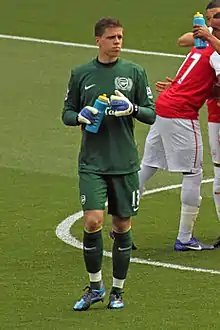 In July 2011, Szczęsny expressed his desire to continue as Arsenal's first choice goalkeeper for the rest of his career.[29] He played a half in each of Arsenal's pre-season games on their tour of Malaysia and China. Szczęsny was assigned the number 13 jersey, formerly worn by Alexander Hleb and Jens Lehmann. During the 2011–12 season, he became Arsenal's first-choice goalkeeper, playing every minute of the team's Premier League matches. On 24 August, Szczęsny made a vital penalty save in the 59th minute of play against Antonio Di Natale in the second leg of the Champions League qualifying round. Arsenal were tied 1–1 (2–1 on aggregate) against Udinese and Szczęsny's penalty save proved vital in securing Arsenal a spot in the lucrative group stage of the competition for the 14th-straight season. Arsenal went on to win the game 2–1 (3–1 on aggregate) with goals coming from Robin van Persie and Theo Walcott. On 28 August, he played in the 8–2 defeat to Manchester United at Old Trafford which turned out to be Arsenal's heaviest ever defeat in the Premier League and the first time they conceded eight goals for over 115 years. On 26 February 2012, Szczęsny finished on the winning side in a North London derby for the first time, as Arsenal came from 2–0 down to win 5–2 at home to Tottenham Hotspur.[30] On 3 March 2012, Szczęsny made a number of important saves and blocked an early penalty to help Arsenal win against Liverpool at Anfield.