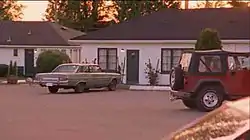 ![]() Outside the hotel room of the paroled criminals. Pine trees are seen to take up most of the sky. A critic heavily criticized the scene and the setting for it, saying that it ruined the show's appearance of taking place in Santa Barbara, California | |