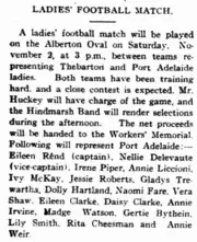 - ↑ "LADIES' FOOTBALL MATCH". Port Adelaide News. Vol. 6, no. 12. South Australia. 1 November 1918. p. 1. Retrieved 14 February 2017 – via National Library of Australia.