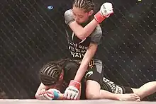 While mixed martial arts is primarily a male dominated sport, it does have female athletes.[1][2][3] For instance, Female competition in Japan includes promotions such as DEEP Jewels. Now defunct promotions that featured female fighters were Valkyrie, and Smackgirl.[4] Professional mixed martial arts organizations in the United States that invite women to compete are industry leader Ultimate Fighting Championship, the all female Invicta Fighting Championships, Resurrection Fighting Alliance, Bellator Fighting Championships, and Legacy Fighting Championship. Now defunct promotions that featured female fighters were Strikeforce and EliteXC.[5] There has been a growing awareness of women in mixed martial arts due to popular female fighters and personalities such as Amanda Nunes, Megumi Fujii, Gina Carano, Cristiane "Cyborg" Santos, Ronda Rousey, Miesha Tate, Holly Holm and Joanna Jędrzejczyk and among others.[6] Carano became known as "the face of women's MMA" after appearing in a number of EliteXC events.[7][8][9] This was furthered by her appearances on MGM Television's 2008 revival of their game show American Gladiators.[10][11][12][13]