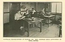 Campaign headquarters were set up in Bangor.[50] The different suffrage groups in the state set aside their differences to campaign for the amendment.[62] The NWP members in Maine formed the Suffrage Referendum League to campaign for the vote.[60] Other groups, such as the WCTU and the Maine Federation of Women's Clubs (MFWC) also contributed to the effort.[64] The entry of the United States into World War I had a significant effect on the suffrage campaign.[64] Many people were focused on supporting the war effort and money needed for the suffrage effort was channeled into war preparedness.[64] Maine suffragists used the war effort to encourage people to support equal suffrage and that women's suffrage was patriotic.[62][60]