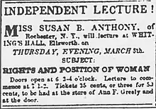 The 1850s in Maine was a time of transition in the state.[1] The abolition movement was important and the temperance movement started to draw more women in Maine.[2] The country's first alcohol prohibition law passed in Maine in 1851.[2] Women's rights also grew in support during the 1850s.[2] Susan B. Anthony came to Maine and gave a lecture in Bangor in 1854.[3] Suffragist Lucy Stone spoke on women's suffrage in Augusta and Cornish in 1855.[4] In Ellsworth, Maine, several women's rights advocates began to work towards women's rights and women's suffrage.[2] Ann F. Jarvis Greely, who had attended the Seneca Falls Convention in 1848, wanted to take action on promoting rights for women.[5] Greely, her sister Sarah Jarvis, and Charlotte Hill worked together to create a committee to bring women's rights lecturers to Ellsworth.[6] The lectures started in 1857.[6] In March of that year, Anthony spoke to a "packed hall" in Ellsworth.[6] There were some threats against the controversial nature of the lecture series, however, overall, the series was "widely attended."[7] In addition to the lectures, the three women hosted a "woman's rights" ball on the evenings of July 3 and 4, 1857 in Ellsworth.[8] Both Greely and Hill also wrote to newspapers under pseudonyms advocating and arguing for improving women's access to equal right.[6] Hill also brought women's rights materials for women to share and distribute.[9] The first women's suffrage petition in Maine, known as a "memorial" was sent to the Maine Legislature in 1857.[10] A second memorial, signed prominently by Greely and Hill, was presented to the legislature in 1858.[9] Maine was one of the first states in the country to petition its legislature on women's suffrage.[10]