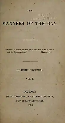 Women as They Are is an 1830 novel by the British writer Catherine Gore, originally published in three volumes.[1][2]It is part of the silver fork novels focusing on fashionable high society of the later Regency era. It is also known by its subtitle The Manners of the Day.[3] It was her first novel published by Henry Colburn, and was a considerable success. George IV described it as "the best bred and most amusing novel in my remembrance.[4]