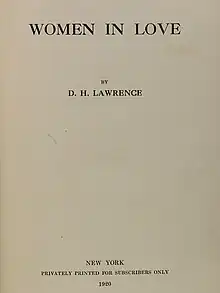 - Lawrence, D.H. (1920). Women in Love (Privately Printed ed.). New York: Thomas Seltzer.