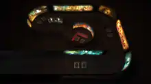 Guardian uses 64 720p projectors to display interactive content on the ride's screens.[1] As the train enters the mountain, the cars rotate to face the screens. Because riders are seated both forwards and backwards, two sets of screens—one for each side— are required. Because Guardian makes tight turns, only the screen on the right-hand side of the track continuously shows content until the end. This screen holds the record for being the longest continuous interactive screen in the world, with a length of approximately 152.4 metres (500 ft) and a height of 4 metres (13 ft).[8][22] The other screen is set up so that as one scene finishes, the transition scene that is seen on the continuous screen is skipped and the next scene begins soon after, keeping both screens in synchronization.[22] Because no physical sets are used in the attraction, the park management can change the film and theme of Guardian at any time.[1]