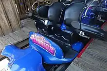 The ride runs one train, with twelve riders arranged in six rows of two across.[12] The train is a Timberliner manufactured by Gravitykraft, and the ride was the first in the United States to use the Timberliner.[11] The Timberliner train features hydraulic restraints,[13] accommodating more guests and allowing it to have a 40-inch (100 cm) height limit.[14] The ride has 1,239 feet (378 m) of wooden track. In total, the ride was constructed with 140,000 board feet of pressure treated Southern pine,[15] alongside 200,000 nails, and 35,000 nuts and bolts.[4]