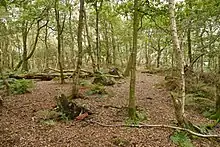 Woodhouse hill fort is an Iron Age hillfort between Frodsham and Helsby in Cheshire, England. It lies at the northern end of the Mid Cheshire Ridge. Woodhouse Hill has steep cliffs on the western sides, providing a natural defence. It is defended by a rampart to the north and east where the ground slopes more gently. Excavations in 1951 showed that the rampart was originally 4m high and revetted with stone on both sides. A number of small rounded stones, believed to be slingstones, have been found on the site.[1][2] The hill fort is protected as a Scheduled Ancient Monument.[3]