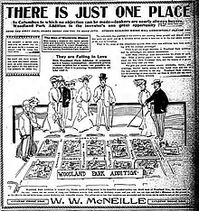 Throughout the 20th century, owners motivated by racism put restrictions in deeds preventing those of African descent from purchasing homes. However, these restrictions eventually became irrelevant, as wealthy African American professionals and musicians could pay the sellers overwhelming amounts of money for said homes.[5] Wexner Heritage Village can cite its beginnings back to Woodland Park.[6] In an interview conducted by the Columbus Jewish Historical Society, Annette Tanenbaum notes that the Heritage House was located on Woodland Avenue near Long Street. She adds that it was the first facility in Columbus dedicated to taking care of elderly Jewish people.[7] Heritage House was built in 1951.[6] Today the Wexner Heritage Village continues to provide elderly care to people in the Jewish community.[8]