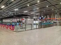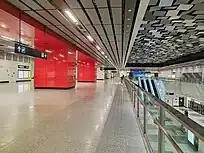 The station's interior has a red and white scheme that was inspired by the National Flag of Singapore, to welcome visitors coming from Malaysia into the country. The station also features aluminium ceiling panels above the platforms which mimic the movements of the daily flux of commuters.[30] The station has a much larger size compared to other MRT stations, as the station was set to accommodate the peak-hour traffic for travellers between Singapore and Johor Bahru.[31] There are two exits from the station.[32]
