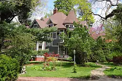 The Woodlawn Historic District is a nationally recognized historic district located in Iowa City, Iowa, United States. It was listed on the National Register of Historic Places in 1979.[1] At the time of its nomination it consisted of 14 resources, all of which are contributing buildings.[2] The district is largely on Woodlawn Street, a gravel dead-end extension of Iowa Avenue. The eastern terminus of Iowa Avenue was originally planned to be a block to the west and was to be the location of the Governor's Mansion, but it was never built. The Old Capitol is on western terminus of the same street. The district is an enclave of upper-middle-class houses on Woodlawn and Evans Streets. Nine of the houses were built in the late 19th century, two were built in the 1920s, and two were built in mid-20th century. There is also a four-story Tudor Revival apartment building on Evans Street that was built in 1926. All of the buildings are located on deep set-backs on large landscaped lots that provide seclusion and cohesion, which is what gives them their significance.[2] The most prominent house is a Queen Anne style home at 1036 Woodlawn Street.