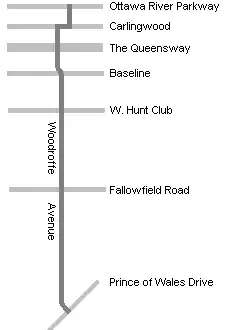 Woodroffe Avenue has a few unusual features. First, it changes alignment significantly at Carling Avenue, requiring a couple of turns. Second, the middle section south of Baseline Road includes dedicated bus lanes as it incorporates the Southwest Transitway. Finally, south of Hunt Club Road, it was quite narrow and very congested as it was a two-lane rural road heading towards Barrhaven. However, the road was recently widened to four lanes to improve traffic flow between Hunt Club Road and Fallowfield Road. A new section of the Transitway was recently built alongside this road.[1]