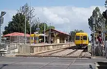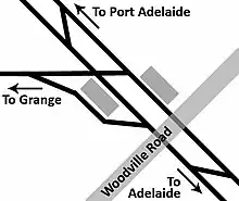 Woodville railway station is the junction station for the Grange and Outer Harbor lines with the lines diverging immediately north of the station.[1] Situated in the western Adelaide suburb of Woodville, it is 7.5 kilometres from Adelaide station. It has auto pedestrian gates and lights. Platform 3 had a small kiosk, built around 2006, that sells refreshments and tickets, but has not been opened since 2009.