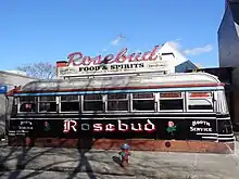 The Miss Worcester Diner (1948) still exists in its original location across the street from the former factory. The Rosebud (1941) is an example at 381 Summer Street in Somerville, Massachusetts near Davis Square.[1][2] The Elmwood Diner (originally known as Central Diner) is Worcester Lunch Car Company #806 built in 1947 and moved to its current location in 1953 where is still operates in the Elmwood section of Providence, Rhode Island. It was added to the National Register of Historic Places in 2010 [3] Worcester Lunch Car Company #821 is still in its original location at 53 Park Street in Adams, Massachusetts. The former "Miss Adams diner" was sold to a couple in 2013 who operate it as Izzy's Diner and Pizza, a full service diner and pizza shop, and still contains many original items including the original Worcester Lunch Car Clock. The car is slowly being restored to look as it did originally. In August 2020, the diner was purchased by a local restaurateur. [4]