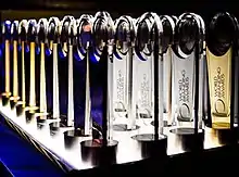 The award trophies are made in Stratford-upon-Avon. The first trophies were manufactured in nickel and gold plate, and accented in acrylic with a design focus on the logo.[14] In 2016, a new gold-plated trophy was introduced for all winners. This is a solid trophy with no acrylic, and highlights the logo.[8] It is 245 mm (9.6 in) in height and 76 mm (3.0 in) in diameter with an angled top, and weighs 1.8 kg (4.0 lb).[15]