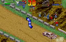 World Rally is a top-down rally racing game reminiscent of Thrash Rally and Carlos Sainz: World Rally Championship, where players observe from above and race across various countries by participating in a single race under a sixty-second time limit.[1][2][3][4] Every location, composed of three stages each, has its own weather conditions and hazards that change how the car is controlled through the track, as well as shortcuts to gain time advantage.[2][3][4] A direction indicator appears during gameplay, allowing players to known about an incoming turn.[3] Players move into the next course by completing the race under sixty seconds, but failing to do so results in a game over screen unless players insert more credits into the arcade machine to continue playing.[2][3][4][5] A second player can also participate by alternating turns.[2][5]