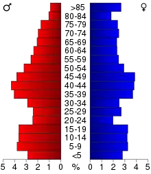 The age distribution was 24.30% under the age of 18, 6.50% from 18 to 24, 26.30% from 25 to 44, 23.50% from 45 to 64, and 19.40% 65 or older. The median age was 41 years. For every 100 females, there were 98.50 males. For every 100 females age 18 and over, there were 95.20 males.