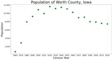 Worth County is a county located in the U.S. state of Iowa. As of the 2020 census, the population was 7,443.[1] The county seat is Northwood.[2] The county was founded in 1851 and named for Major General William Jenkins Worth (1794–1849), an officer in both the Seminole War and the Mexican–American War.