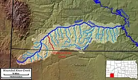 The creek rises in the southwestern corner of the Pine Ridge Indian Reservation, along the state line with Nebraska, and flows northwest. It borders the site of the 1890 Wounded Knee Massacre, in which United States Army troops from the 7th Cavalry Regiment massacred approximately 300 Lakota people, most of whom were unarmed women and children.[3][4] Towns in this region include Wounded Knee and Manderson. The Wounded Knee Creek flows NNW across the reservation and joins the White south of Badlands National Park.