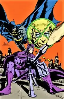 The first Wrath was an enemy of Batman, described by him as his "opposite number".[2] The Wrath's appearance and motivation are reminiscent of Batman's, but with notable differences. The Wrath (like Batman) is distinguished by perfectionism and obsession with what he does. His costume is also very similar to Batman's (though colored in crimson and purple with a W-insignia on the chest and cowl; the W on his cowl, when seen in the right light and at the right angle, looks like the ears of the Batman's cowl).