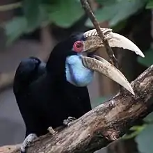 The wreathed hornbill (Rhyticeros undulatus) is an Old World tropical bird of the hornbill family Bucerotidae, also called bar-pouched wreathed hornbill due to its distinctive blue-black band on its lower throat sac. It is named after its characteristic long, curved bill that develops ridges, or wreaths, on the casque of the upper mandible in adults. Males are black with a rufous crown, a white upper breast and face, and a yellow featherless throat. Females are uniformly black with a blue throat and are slightly smaller than males.