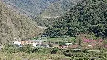 The Wanda Power Station (萬大發電廠; Wàndà Fādiànchǎng) is located about 2 kilometres (1.2 mi) downstream and was the only part of the project to be completed before the construction halted due to World War II. In 1943, it began generating power using water from Wanda Creek, which joins with the Wushe Creek here to form the Zhuoshui River. The three Pelton turbines installed at the time are known as unit G3 and have a capacity of 15,000 kilowatts (KW).[7]