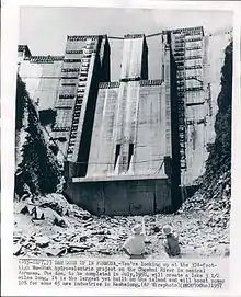 When World War II broke out in 1941, industrial resources were increasingly diverted to the war effort and construction was halted in 1944 with only the power plants and 6 percent of the dam complete.[2][3] After the war, Taiwan Power Company (Taipower) took over the project with aid from the United States Agency for International Development. The U.S. Bureau of Reclamation consulted on a re-design which increased the dam height to 114.6 metres (376 ft).[4] Construction resumed in May 1953. The reservoir first filled in 1957, and the project was officially completed in August 1960, at a cost of NT$376,077,000.[5]