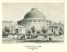 Wyld had approached the organizing committee of the Great Exhibition with a plan to erect a giant globe within the exhibition hall. Although he presented it as an educational attraction, Wyld's ulterior motive was to use the globe to promote his map-making business. The size of the proposed exhibit and the organizers' decision that no commercial enterprises should use the exhibition as a platform to sell their goods or services led to the rejection of Wyld's plan.[6][note 3] Undaunted, Wyld began to search for an alternate location for his project; the reason later given for not building within the Crystal Palace was purely the lack of space rather than any rejection by the organizing committee of the commercial aspect of the project. An article in The Builder on 30 November 1850 mentioned that negotiations were already underway to secure the gardens of Leicester Square. Described in Charles Dickens' Household Words as a "howling desert",[9] the gardens were at that time an insalubrious area, "with broken railings, a receptacle for dead cats and every kind of abomination"[10] and a meeting place for "ne'er well-to-do youths".[11] Leicester Square had been Prince Albert's initial choice as a site for the Great Exhibition building, but the site was quickly dismissed as too small.[12][13]
