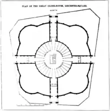 Through an advertisement in The Builder, Wyld contracted Edward Welch as the architect for the project. Welch submitted his first set of plans in January 1851. These plans included the construction of four theatres which Wyld planned to rent out to recoup his expenses, but there was vigorous opposition from the residents of the square,[19] and when Wyld put the plans out to tender, the cheapest quote – from George Myers – was £2,561. Welch negotiated this down to £1,888,[20][21] but Wyld informed Welch that he considered the price prohibitive. As he was embroiled in negotiations with Henry Webb at the same time, Wyld decided that he would have to settle for something less ambitious and to "give up a great part of the original design of the building". He showed Welch's initial designs to the architect H.R. Abraham who considered that they were impractical.[20] Wyld was worried about Welch's ability to meet his deadlines and asked him to pass any plans to Abraham for approval.[19]