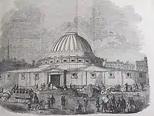 The Panopticon of Science and Art, constructed in the square in 1854, also affected visitor numbers.[63] The Panopticon was constructed by a consortium hoping to take advantage of the market for scientific and cultural attractions, but like the Great Globe it struggled to draw sufficient visitors.[15] After two years the Panopticon closed down; it reopened shortly afterwards with the addition of a circus ring, but still proved to be uneconomical and quickly closed again. Renamed the Alhambra, it reopened as a theatre and music-hall in which form it endured until the 20th century.