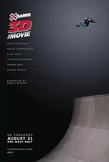 X Games 3D: The Movie is an action sports/documentary 3-D film released on August 21, 2009, for one week only.[1] Produced by ESPN Films and distributed by Walt Disney Studios Motion Pictures, the film captures the drama and spectacle that plays out every year at the X Games, highlighting the behind-the-scenes stories of the featured athletes and the sacrifices they make in pursuit of glory and the advancement of their sports on the industry's biggest stage.[2]