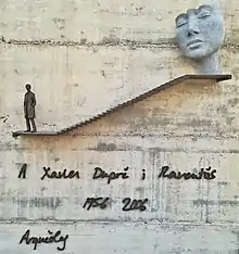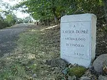 The premature death of Dupré in 2006 shocked the archaeological world and the scientific institutions he was part of the International Committee on Archaeological Heritage Management of ICOMOS, the Deutsches Archäologisches Institut, Real Academia de la Historia or the Istituto Internazionale di Studi Liguri.[9] After his death, the academic community began to pay him tribute in a series of events such as homages at the Institut d’Estudis Catalans or the CSIC. The International Association of Classical Archaeology also held a one-day conference in his honour at the Università degli Studi di Roma La Sapienza. On April 21, 2007, his ashes were scattered at the theatre of Tusculum.[10] To mark the occasion, local association XI Comunità Montana del Lazio Castelli Romani e Prenestini erected a monument at the start of the path to the site commemorating his work. The inscription on the monument reads “A Xavier Dupré, archeologo di Tuscolo” [To Xavier Dupré, archaeologist of Tusculum]. In 2008, Tarragona local council decided to name a public space in the city after Dupré and in 2012, Dupré was honoured with a posthumous Diploma al Mèrit Cultural[11] by the city of Tarragona. In 2016, the Catalan city held the third International Congress of Archaeology and Ancient world.[12] In 2018 a sculpture by the Italian artist Beátrice Bizot was placed on the Tarraco Circus arena in his memory.[13][14]