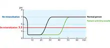 Salivary flow rate is decreased during sleep, which may lead to a transient sensation of dry mouth upon waking. This disappears with eating or drinking or with oral hygiene. When associated with halitosis, this is sometimes termed "morning breath". Dry mouth is also a common sensation during periods of anxiety, probably owing to enhanced sympathetic drive.[11] During periods of stress, our body responds in a ‘fight or flight’ state that will interfere with the saliva flow in the mouth.[12] Dehydration is known to cause hyposalivation,[1] the result of the body trying to conserve fluid. Physiologic age-related changes in salivary gland tissues may lead to a modest reduction in salivary output and partially explain the increased prevalence of xerostomia in older people.[1] However, polypharmacy is thought to be the major cause in this group, with no significant decreases in salivary flow rate being likely to occur through aging alone.[9][13]