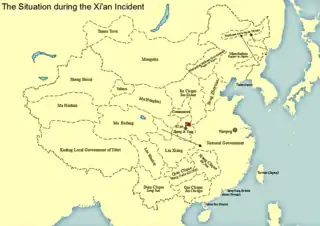 By late 1935 the Communists had narrowly avoided destruction on their Long March and had begun to establish themselves in a new base area on the border between Gansu and Ningxia provinces. They were besieged by a number of nationalist armies, including the Northwestern Army under Yang and the Northeastern Army, to which Chang was re-assigned as commander after his return from a tour of Europe.[6][7] The Nationalist armies initially gave no notice to the Communist exhortations for war against Japan, but this began to change because of the Red Army's "eastern expedition" from February to April 1936. The Communists declared that they were sending a detachment through Shanxi to fight the Japanese in Rehe and Hubei. Letting the Red Army through would have broken the encirclement, so Yan Xishan stopped them by force. Although defeated militarily, the Red Army had convinced the Shanxi peasantry of their patriotism and gained 8,000 new recruits on their retreat. Chang was likewise impressed and began to see them as potential allies rather than foes. When Mao announced on March 14 that the Communists were willing to conclude a truce, Chang covertly agreed.[8] He proposed to Chiang Kai-shek that he reverse the Nationalist policy of prioritizing the purge of Communists, and instead focusing on military preparation against Japanese aggression.[9] After Chiang refused, Chang began to plot a coup in "great secrecy".[10] By June 1936, the secret agreement between Chang and the CCP had been successfully settled.[11]