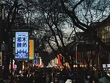 The Xi'an Muslim Quarter (Chinese: 西安回民街) is a snack and commercial street situated in the center part of Xi'an, China. It is close to the Bell Tower and the Drum Tower. Shehui Road is to the east, Zaoci Lane to the west, West Avenue to the south, and Hongfu Street to the north.[1] There are ten mosques in the area. The biggest one is the Great Mosque, which was listed as the state-level protected heritage for its traditional buildings and religious significance.[2] According to demographic statistics in 2010, about 60,000 people live in this area, more than half of which are the Huis and the others are the majority Hans.[3] In the past few decades, Xi'an Muslim Quarter has become a well-known tourism site which is famous for its culture and food. It attracts visitors from all over the world each year.