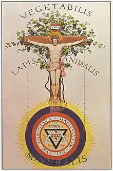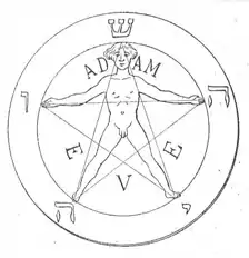 In Renaissance occultist works, this pentagrammaton (or five-letter divine name) was frequently arranged around a mystic pentagram, where each of the five Hebrew letters י ה ש ו ה was placed at one of the points (the letter shin ש was always placed at the upward-pointing vertex of the pentagram).[2] One of the earliest attested examples of this diagram is in the Calendarium Naturale Magicum Perpetuum or "Magical Calendar" (published 1620 but dated 1582)[3] of either Theodor de Bry (Flemish-born German, 1528–1598) or Matthäus Merian the Elder (Swiss, 1593–1650).[4] The idea of the pentagrammaton was funneled into modern occultism by 19th-century French writer Eliphas Levi and the influential late 19th-century Hermetic Order of the Golden Dawn. The Golden Dawn favored the consonantal transcription IHShVH or YHShVH, and the pronunciation Yeheshuah.