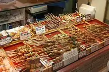 Yakitori (Japanese: 焼き鳥) (literally 'grilled bird') is a Japanese type of skewered chicken. Its preparation involves skewering the meat with kushi (串), a type of skewer typically made of steel, bamboo, or similar materials. Afterwards, it is grilled over a charcoal fire. During or after cooking, the meat is typically seasoned with tare sauce or salt.[1] The term is sometimes used informally for kushiyaki (grilled and skewered foods) in general.