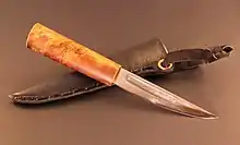 Typical Yakutian knives have a blade length of 4–7 inches (10–18 cm), and 1–1+1⁄2 inches (2.5–3.8 cm) wide. An unusual feature of this knife is that the blade is asymmetrical; one side of the blade has a fuller, that is a groove in it and a chisel grind, while the other side has no groove and is basically a convex edge (meaning it rounds down to the edge, rather than having a straight bevel).[2] The blade is traditionally forged[3][4][5] from locally sourced iron ore smelted by Yakutian blacksmiths. The groove in the blade makes it lighter and allows the blacksmith to reduce the amount of metal needed to make larger knives. The knife handle is historically made from birch burl and is thick and egg-shaped in cross-section. It fits the hand and can also be used wearing gloves. The birch also protects the hand from the cold effects of the knife steel in extreme cold, a common condition in Siberia during winter months. A cow tail knife sheath completes the ensemble.