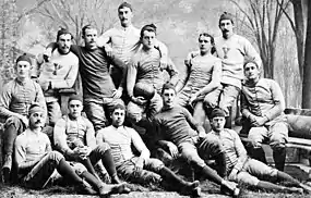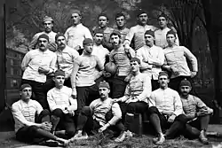 The Bulldogs were the dominant team in the early days of intercollegiate football, winning 27 college football national championships, including 26 in 38 years between 1872 and 1909.[3] Walter Camp, known as the "Father of Football," graduated from Hopkins Grammar School in 1876, and played college football at Yale College from 1876 to 1882. He later served as the head football coach at Yale from 1888 to 1892.[4] It was Camp who pioneered the fundamental transition of American football from rugby when in 1880, he succeeded in convincing the Intercollegiate Football Association to discontinue the rugby "scrum," and instead have players line up along a "line of scrimmage" for individual plays, which begin with the snap of the ball and conclude with the tackling of the ballcarrier.[5] In 1916, against the advisement of coach Tad Jones, Yale quarterback Chester J. LaRoche (1918s) helped lead the Yale team in a win against Princeton by turning the momentum of the game with a fourth-down call in the huddle to go for first down rather than punt. The team made the down and went on to win the game in one of Yale's greatest victories in its history. LaRoche went on to spearhead the creation of the National Football Foundation and Hall of Fame.[6]