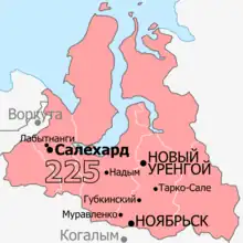 | Districts | Gubkinsky, Krasnoselkupsky, Labytnangi, Nadym, Nadymsky, Muravlenko, Novy Urengoy, Noyabrsk, Priuralsky, Purovsky, Tazovsky, Salekhard, Shuryshkarsky, Yamalsky |