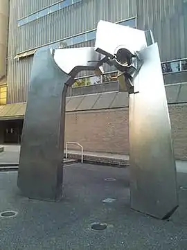 Yankee Champion is a welded stainless steel sculpture with an aggregate concrete base by Thomas Morandi, located at the southeast corner of Southwest Broadway and Montgomery Street on the Portland State University campus.[1] Described as a "conglomerate of shapes supported by three irregularly shaped legs",[2][3] the piece measures approximately 14 feet (4.3 m) tall x 13 feet (4.0 m) long x 13 feet (4.0 m) wide and weighs 1.5 tons.[1] Morandi worked on Yankee Champion from 1983 to 1985. It was commissioned by the Oregon Percent for Art in Public Places Program in 1984 at a cost of $29,000, and was dedicated on October 24, 1985. Nitric acid was applied to its finished surface to prevent white scaling.[1] A plaque below the sculpture contains the inscription: