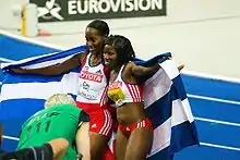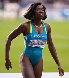 Savigne won her second major outdoor gold medal at the 2009 World Championships. Her jump of 14.95 m was enough to win in a modest competition which saw compatriot Mabel Gay take silver with 14.61 m.[1] The following year she won the silver medal at the 2010 IAAF World Indoor Championships, finishing behind Olga Rypakova who made the third longest indoor jump ever for the gold.[2] In the outdoor season, she improved her long jump best to 6.91 m in Reims at a meeting on the Alma Athlé Tour, despite having trouble with her right ankle. She remained focused on her triple jump speciality, however, aiming to return to her 2007 peak form.[3]