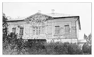 The estate of Yasnaya Polyana was originally owned by the Kartsev family. In the 18th century, it was purchased by major-general Prince Sergey Volkonskiy and then passed to his son, general-in-chief Prince Nikolai Volkonskiy,[7] the grandfather of the writer. Nikolai lived in what is now known as the 'Volkonskiy house' before commencing to build the main, single-storey manor house in 1810, at the highest point of the estate. This was flanked by two two-storey wings, linked by decking.[8] He also built stables, a coach-house, a bathhouse, summerhouse, and two orangeries linked by a gallery,[1] and created a formal French garden, an English landscape garden with a cascade of ponds, and long avenues of birch and oak trees.[9]