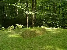 Long before he died Tolstoy announced the place where he wanted to be buried: in a small clearing called "the place of the green wand", next to a long ravine in a part of the old forest called the Forest of the Old Order (Старый Заказ, Stariy Zakaz) because cutting trees there had been forbidden since the time of his grandfather, and many trees there were over a hundred years old. The name 'place of the green wand' had been given by Tolstoy's older brother Nikolai, who said that the person who found the magic wand there would never die or be ill. He and his brother frequently sat in the darkness in the clearing and talked.[22]
