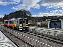 The station has two opposed unnumbered side platforms connected to the station building by a level crossing. The station is unattended.